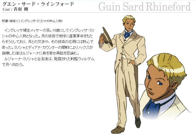 地球方代表吉恩.薩德.萊茵福德,可謂集舊世代高達大成的政治人物。他能力卓越優越,前巿長不幸喪生後,19歲出身名門望族的吉恩擔起了領導的大旗。